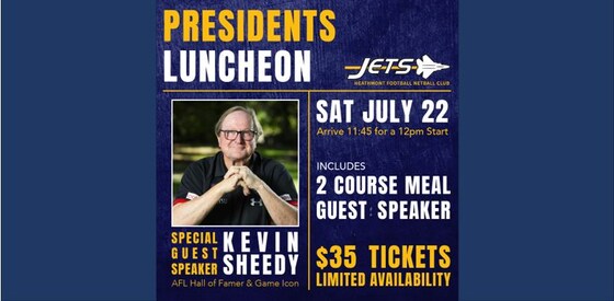 Guest speaker Kevin Sheedy - AFL Hall of Fame Member and game Icon Saturday July 22nd Arrive 12:00 for a 12:15 start Limited number of tickets available for $35 per head. Price includes 2 course lunch and guest speaker. Drinks at bar prices